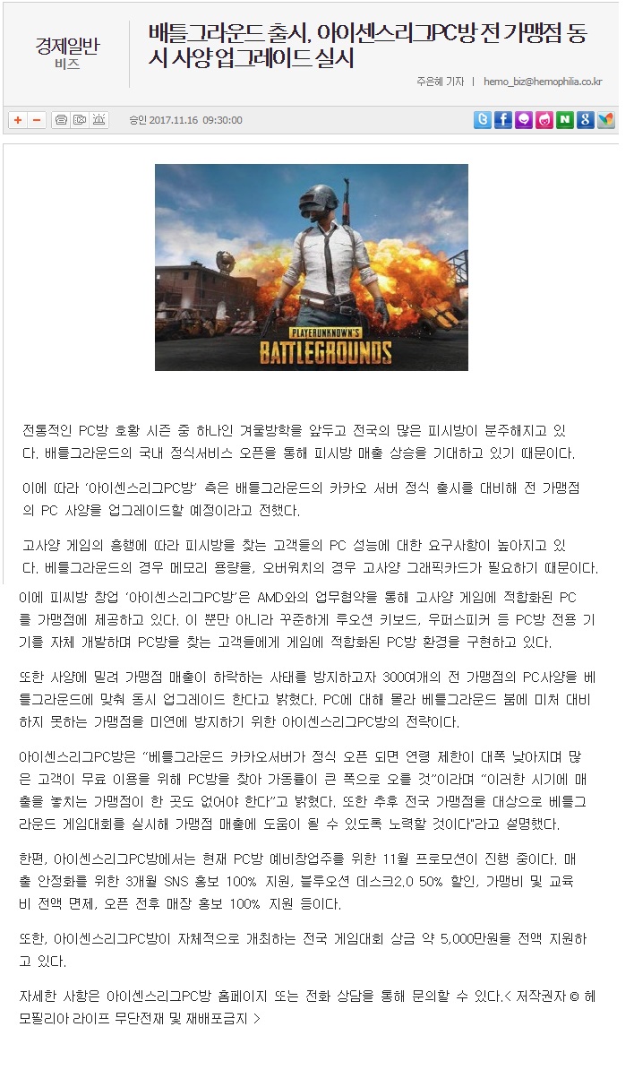 배틀그라운드출시, 아이센스리그PC방 전 가맹점 동시 사양 업그레이드 실시!
