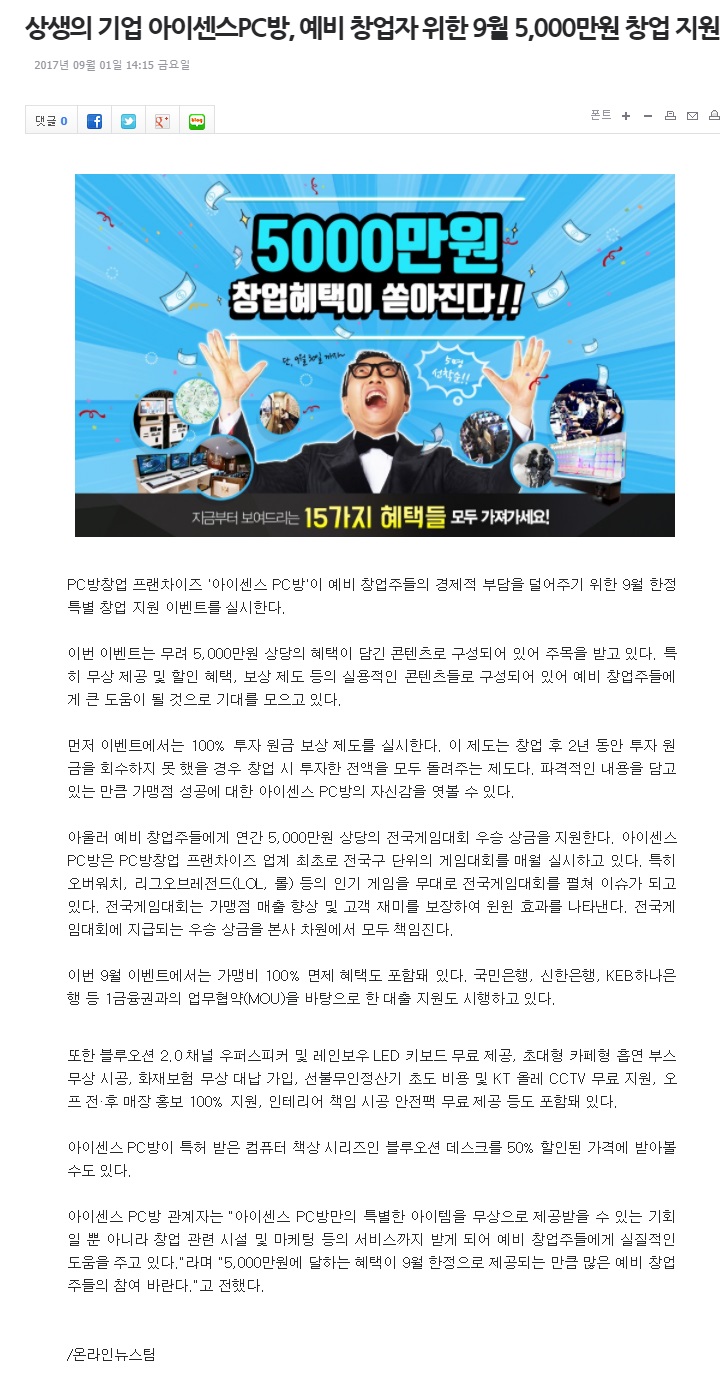 상생의 기업 아이센스PC방, 예비 창업자 위한 9월 5,000만원 창업 지원