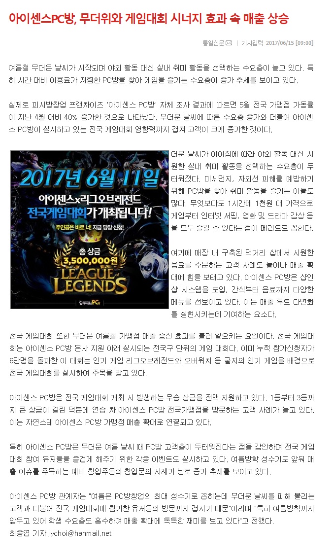 아이센스PC방, 무더위와 게임대회 시너지 효과 속 매출 상승