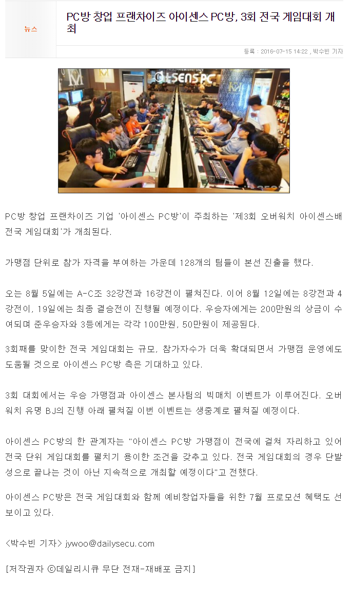 PC방창업 프랜차이즈 아이센스 PC방, 12일 오버워치 대회 본선 개시
