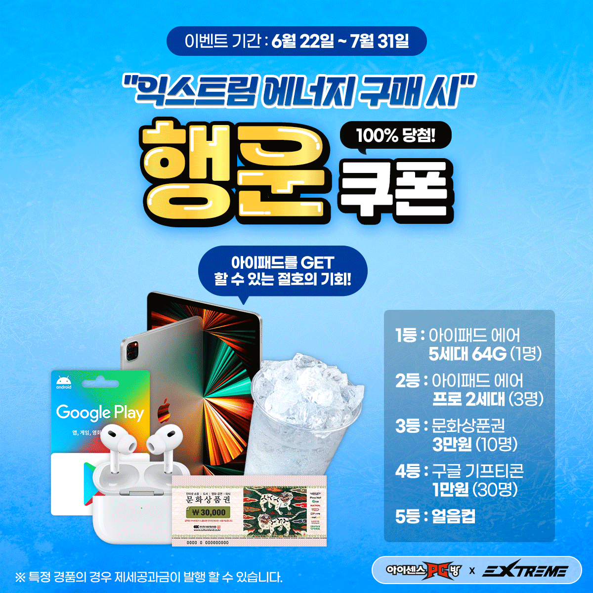 ![]() 아이센스PC방 100% 당첨 행운쿠폰 이벤트 아이센스PC방과 익스트림 에너지가 함께하는 행운쿠폰 이벤트를 진행합니다. 100% 당첨되는 행운쿠폰 이벤트에 참여하세요~! 아이패드, 에어팟, 문화상품권, 구글 기프티콘까지 푸짐한 상품이 여러분을 기다리고 있습니다! ▶참여 기간◀ 7월 31일(월)까지 ▶참여 방법◀ 2) 익스트림 에너지 음료수를 구매한다. 3) 익스트림 에너지 음료수를 즐기며 쿠폰을 긁는다! 4) 당첨된 쿠폰을 매장 카운터에 제출한다. ▶상품지급◀ 이벤트 종료 후 1등, 2등, 3등, 4등 상품 지급 지금 바로 아이센스PC방에서 게임도 즐기고 아이패드를 얻으세요~ |