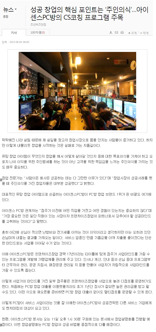 성공 창업의 핵심 포인트는 ‘주인의식’…아이센스PC방의 CS코칭 프로그램 주목